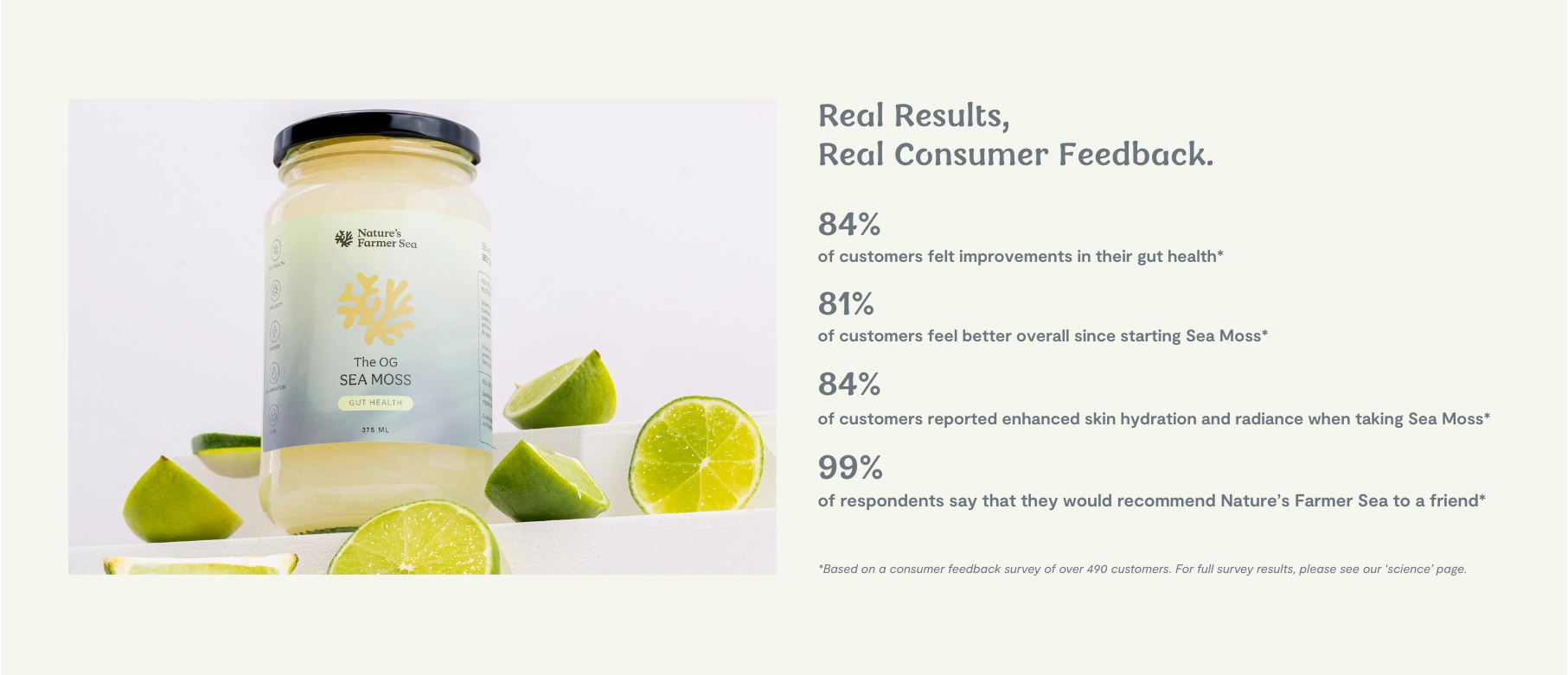 The hero of it all. Ocean-harvested from the pristine waters of St Lucia in the Caribbean, our Sea Moss is naturally rich in minerals, fibre, and plant compounds. It’s carefully washed, sun-dried, and prepared to preserve its integrity before we turn it into gel.